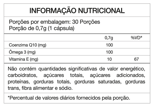 Ômega 3 vegetal em pó, coenzima Q10, acetato de DL-Alfa-tocoferol, antiumectantes fosfato tricálcico, dióxido de silício e talco. Cápsula (hidroxipropilmetilcelulose). NÃO CONTÉM GLÚTEN.