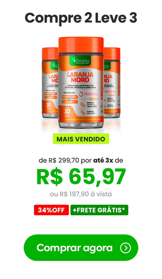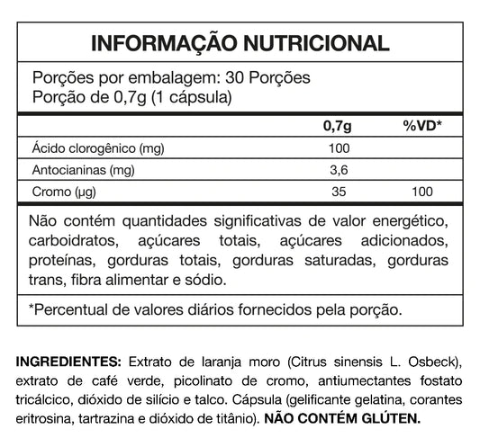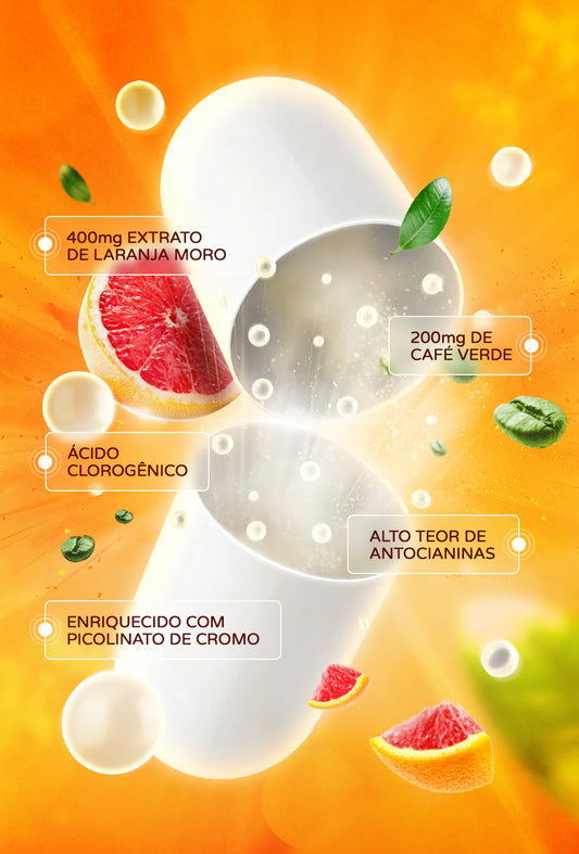 O Extrato de Laranja Moro, rico em Antocianina, combate radicais livres e reduz gordura localizada. Já o Picolinato de Cromo ajuda no controle do apetite, promovendo saciedade.