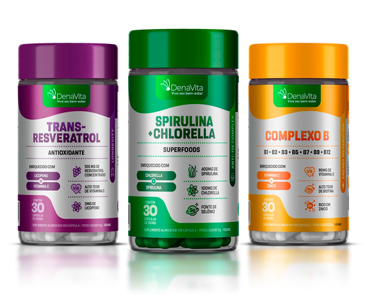 Trans-Resveratrol, Spirulina e Ômega 3 em sinergia para vitalidade, equilíbrio e proteção diária.