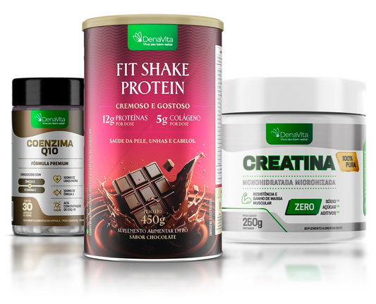 Coenzima Q10, Creatina 100% Pura e Fit Shake Protein para disposição, desempenho e suporte nutricional diário.
