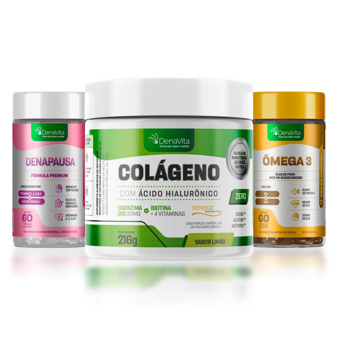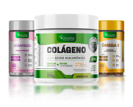 Suporte feminino com Denapausa, Colágeno em Pó e Ômega 3.