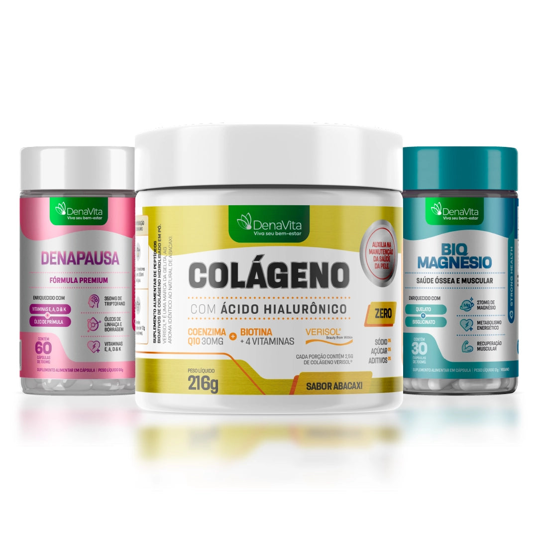 Denapausa, Magnésio Quelato e Colágeno em sinergia para vitalidade, equilíbrio e bem-estar diário.
