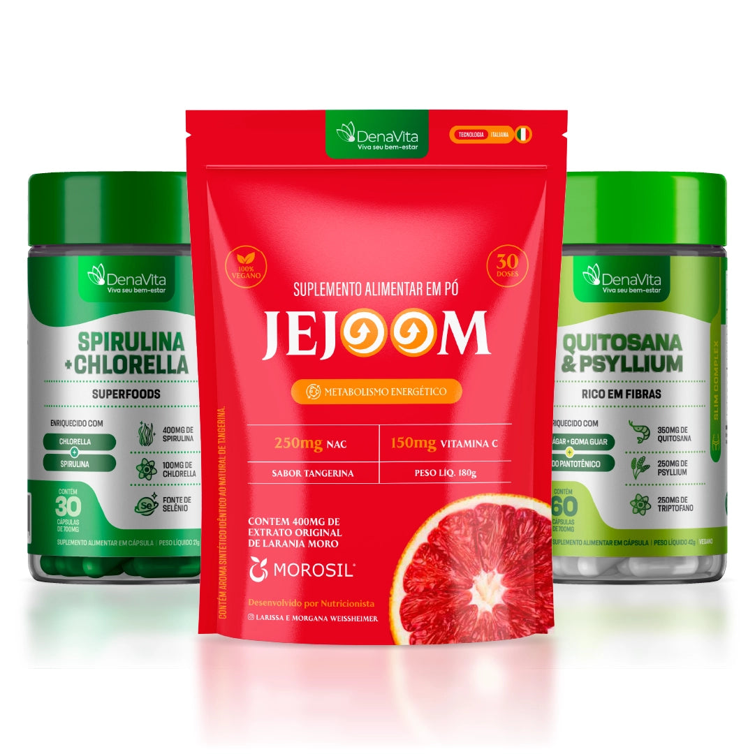 Equilíbrio, digestão e energia com Quitosana, Psyllium, Triptofano, Jejoom e Spirulina.